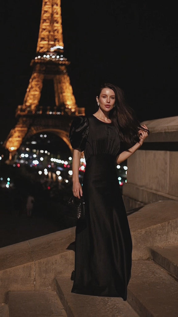 Make a statement with the Drama Dress, an elegant black satin maxi dress designed for those who embrace sophistication. This dress features trendy puff sleeves and a gracefully draped back, combining modern style with classic elegance. Crafted from a luxurious blend of silk with an organza weave and viscose, it offers a fluid, stunning silhouette that is perfect for any grand occasion.